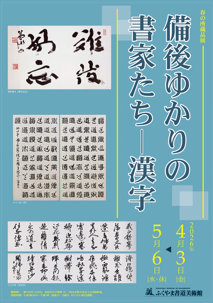 当展覧会は2期に分け、備後福山にゆかりのある漢字書家を春の所蔵品展で、同じくかな書家を夏の所蔵品展1で紹介します。