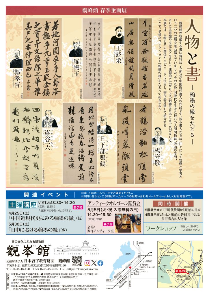 観峰館が収蔵する書法資料は、大部分が中国近代書人の作品です。彼ら書人たちは、往々にして官僚と学者という二つの立場を兼ね備えていました。そのため、同時代を生きた彼らの人間関係は、政治や学問、さらには思想や文化などを介して連鎖的に広がり、その影響は日本にまで及びました。本展では、人物とその関係やエピソードに注目して書作品を紹介することで、多様なコネクション=「翰墨の縁」をたどってゆきます。