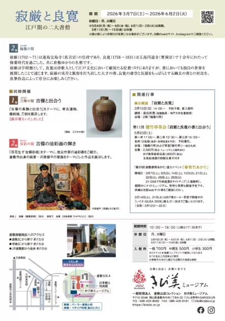 寂厳(じゃくごん・1702~71)は連島宝島寺(真言宗)の住持であり、良寛(りょうかん・1758~1831)は玉島円通寺(曹洞宗)で十余年にわたって修業時代を過ごした、共に倉敷ゆかりの名僧です。寂厳は学問僧として、良寛は詩歌人として江戸文化において確固たる位置づけにありますが、書においても独自の世界を展開したことで通じます。寂厳の実存と脱俗を打ち出した大才の書、良寛の虚空と気韻をもっぱらとする幽玄の書との対比を、真筆作品によって存分にお楽しみください。