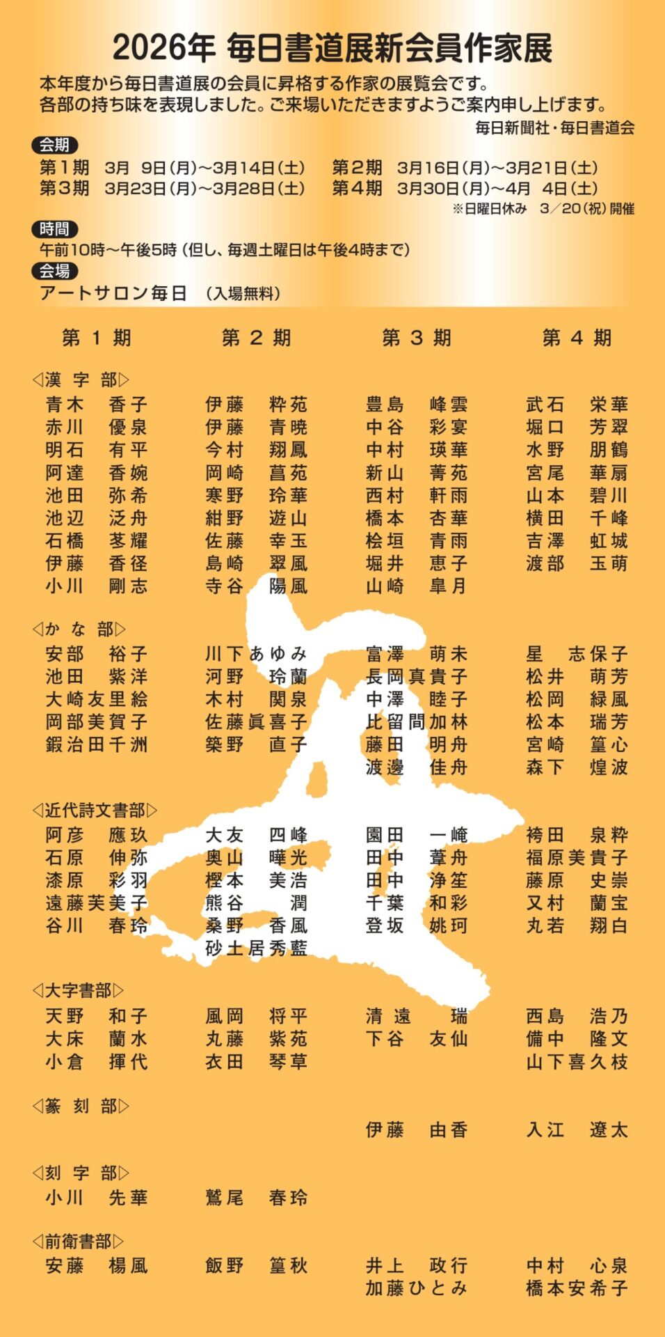 ■会期 第1期:3月9日(月)~3月14日(土) 第2期:3月16日(月)~3月21日(土) 第3期:3月23日(月)~3月28日(土) 第4期:3月 30 日(月)~4月4 日(土) ※日曜日休み、3月20日(祝・金)開催